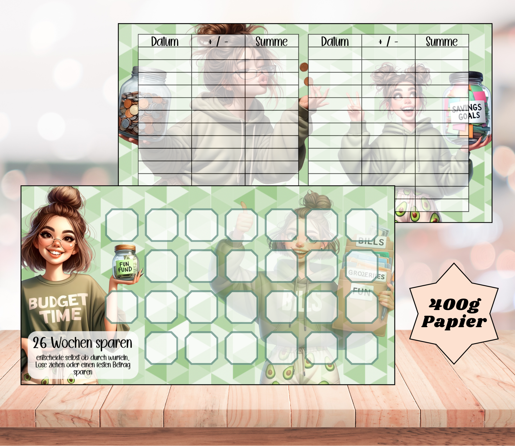 Gedruckt wird die Sparchallenge auf hochwertigem mit 400g Papier und Tracker sind mit aufgedruckt.