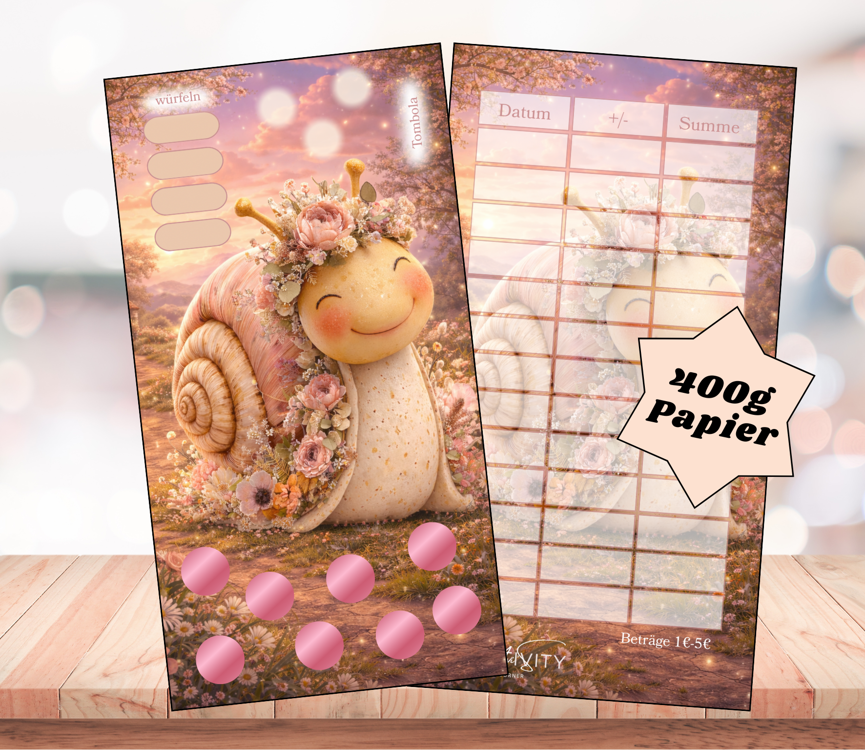 Gedruckt wird die Sparchallenge auf hochwertigem Papier mit 400g und Tracker sind mit aufgedruckt.