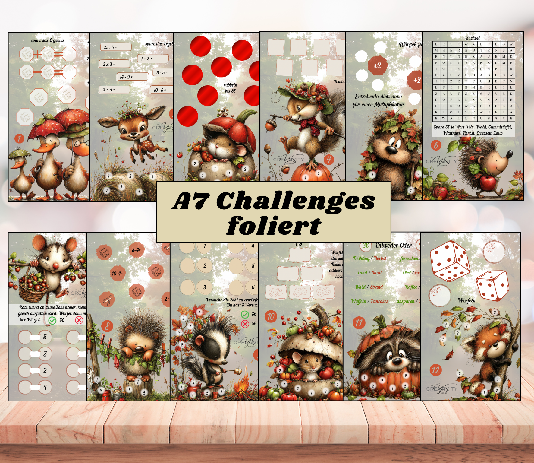 Hierbei handelt es sich um ein komplett matt foliertes Set. Das Dashboard mit Tracker und die Entscheidungshilfe ist in A6. Die Challenge kommt mit 6 doppelseitig bedruckten Challenges in A7 die super viel Abwechslung bieten! Als Entscheidungshilfe welche Challenge du als Nächstes besparst, gibt es eine Rubbelchallenge oder du nutzt einen 12er Würfel. Das ist ganz Dir überlassen. Und wenn du einen wasserlöslichen Folienstift verwendest, kannst du das Set immer wieder besparen.